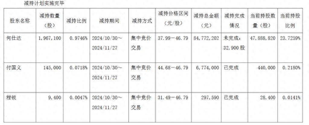淳中科技(证券代码:603516)公告,股东及董监高集中竞价减持股份结果已披露。董事长何仕达通过集中竞价交易减持1,967,100股,占总股本的0.9746%;董事付国义减持145,000股,占0.0718%;高管程锐减持9,400股,占0.0047%。减持价格区间分别为37.99-46.79元、44.68-46.79元及31.49-46.79元。