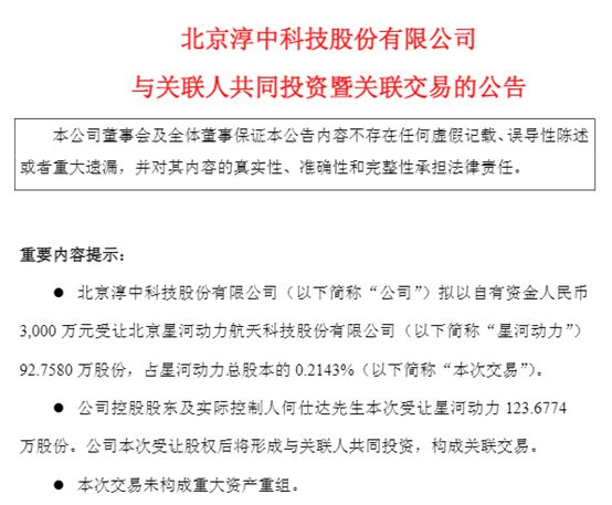 公告显示,淳中科技拟以自有资金3000万元受让相关标的资产。本次交易属于相关规定关联交易类型中的“与关联人共同投资”情形,交易标的为星河动力92.758万股股份,占星河动力总股本的0.2143%。交易标的产权清晰,不存在抵押、质押及其他任何限制转让的情况,不涉及诉讼、仲裁事项或查封、冻结等司法措施,亦不存在妨碍权属转移的其他情况。