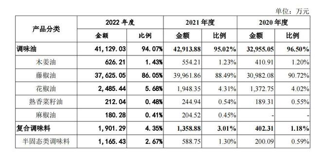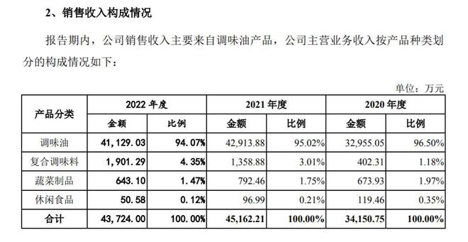 2020年、2021年及2022年,幺麻子分别实现营业收入3.56亿元、4.62亿元、4.50亿元;实现净利润1.02亿元、9789.66万元和8115.45万元。报告期内,幺麻子藤椒油的收入分别为3.10亿元、4.00亿元、3.76亿元,占比分别达90.72%、88.49%、86.05%。