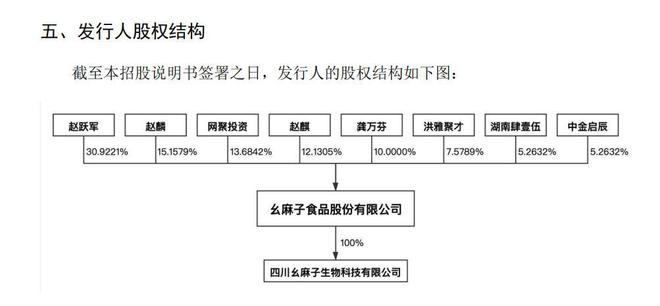 在幺麻子的股东名单中,还有上市公司绝味食品的身影。招股书显示,除赵跃军一家四口外,幺麻子的股东还包括网聚投资、洪雅聚才、湖南肆壹伍、中金启辰。