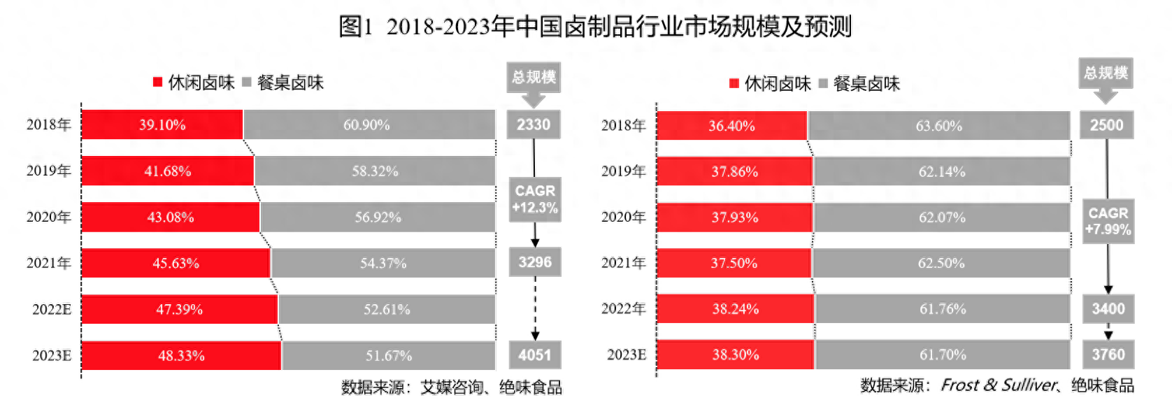 根据Frost & Sullivan、艾媒咨询的数据显示,2023年中国卤制品行业的规模有望达到3700~4000亿,行业整体规模持续扩大,休闲卤味行业的增速领先餐桌卤味。身处行业中心,今年绝味食品的业绩具有说明力。