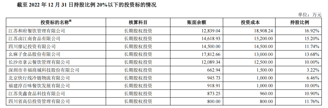 具体来看,绝味食品的长期股权主要围绕卤味、调味品、供应链等产业进行布局。公司通过投资和府捞面、廖记棒棒鸡、幺麻子、千味央厨和盛香亭等品牌的母公司,试图扩大自身的业务范围和市场份额。