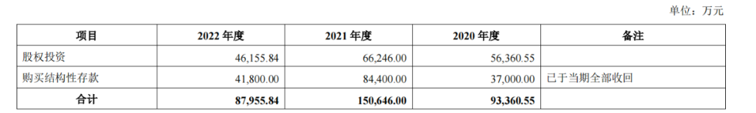 2020年-2022年,绝味食品为投资支付的现金流出主要集中在购买结构性存款和股权投资上。在这三年里,公司投资支付的现金分别为9.34亿元、15.06亿元、8.8亿元,但获得的投资收益却不尽如人意,分别为-1亿元、2.23亿元和-0.94亿元。