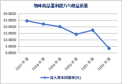 自上市以来,绝味食品的投资回报率总体呈下滑趋势。2017-2022年,绝味食品的投资回报率分别为24.44%、22.02%、20.06%、14.17%、17.35%、3.38%和4.90%。