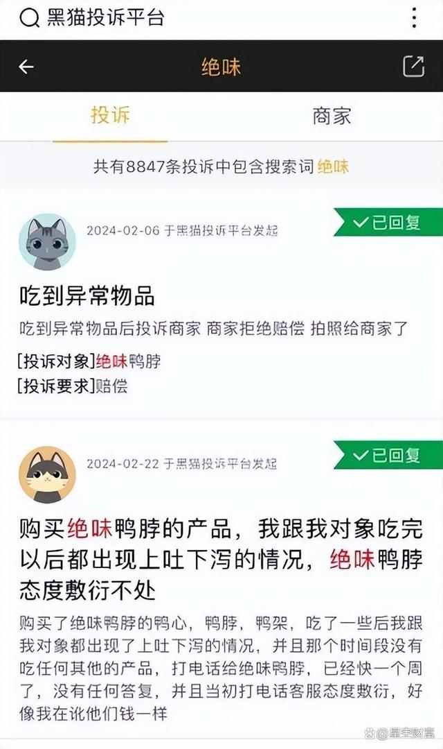在黑猫投诉平台上,绝味的累计投诉约734条,投诉内容主要是吃到异物、食物中毒、吃到虫子等等。