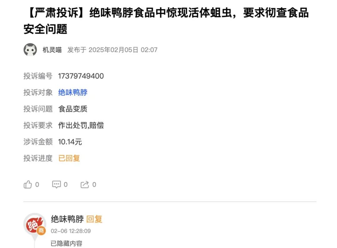 在黑猫投诉以“绝味”关键词进行搜索,有13754条投诉,2月9日有消费者投诉在绝味鸭脖线下消费店买的鸭肠变质,并且有绿色脓包,当时就吐了,但是售卖商家称却称没有问题。也有消费者称:“我于(2024年)12月3日18点30分在绝味鸭脖大话南门店购买了22块钱鸭脖,赠送了一点毛豆,毛豆我尝了三个,吃着明显是坏的,我就把毛豆扔了。鸭脖调料味比较重,当时没吃出来是不新鲜的,所以全吃完了,第二天早上起来就拉肚子了。”