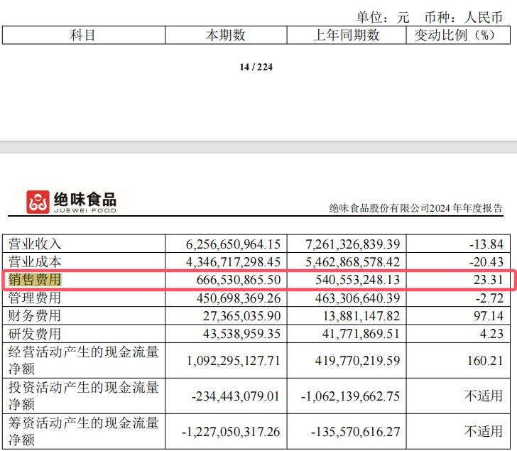 为了吸引年轻消费者,绝味食品在2024年重金签约了顶流明星范丞丞作为品牌代言人。然而,这一策略带来了高昂广告费用。数据显示,公司的销售费用同比增长了23.31%,而广告费用和市场费用更是大幅增长至2.17亿元