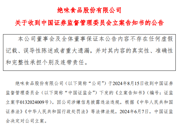 2024年8月15日,绝味食品收到中国证券监督管理委员会立案告知书