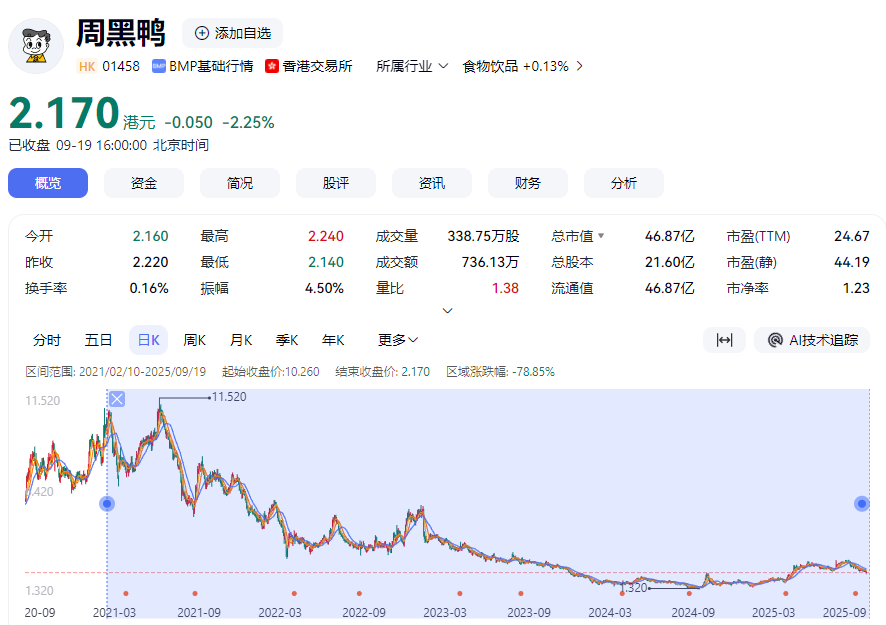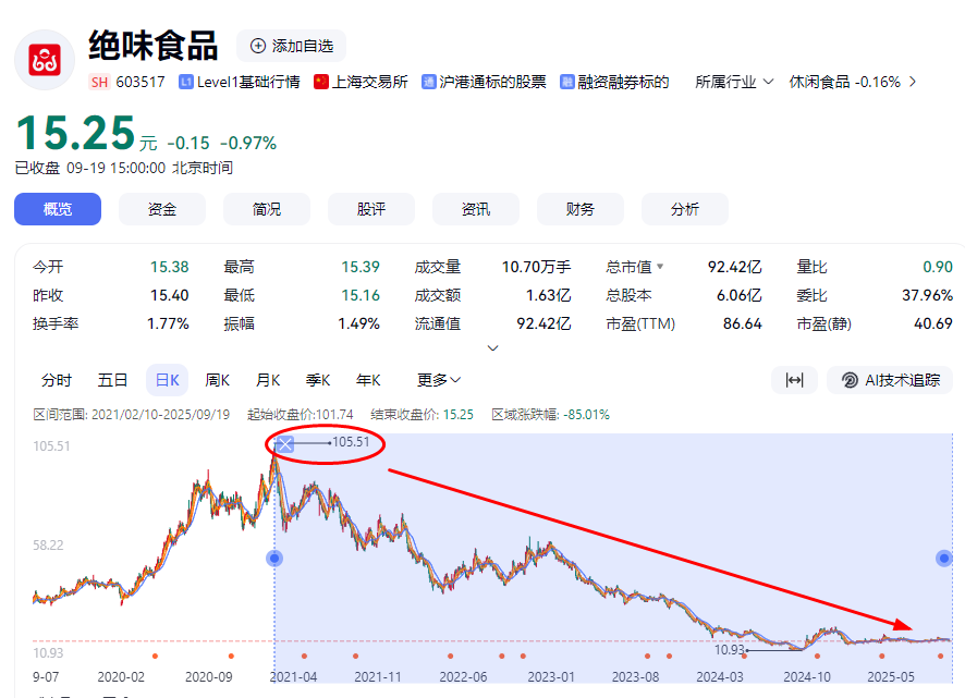 市场对此次“戴帽”反应相对平静,9月19日股价跌幅小于预期,但这更多源于前期利空释放。2024年8月15日立案消息公布后,公司股价曾直接一字跌停。有网友在社交平台留言:“以后买鸭脖会不会看到包装印着ST?”这种调侃背后,是消费者对品牌信任度的微妙变化。一位长期持有绝味股票的投资者表示:“罚款金额不大,但八年财务数据失真让人后怕,更担心的是未来增长没了方向。”