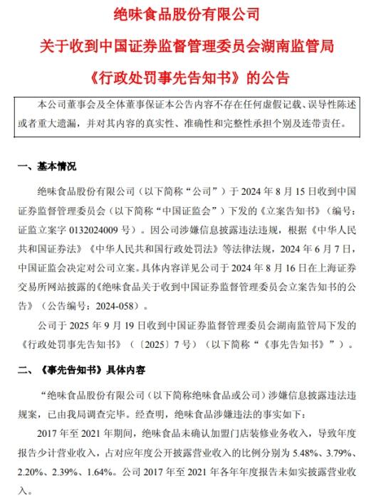 9月19日,绝味食品曾发布公告,公司收到中国证券监督管理委员会湖南监管局下发的《行政处罚事先告知书》(以下简称《事先告知书》)。