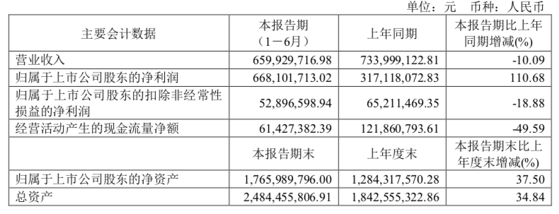 8月18日,立霸股份发布2023年半年度业绩报告称,上半年公司实现营业收入65,992.97万元,同比下降10.09%;归属于公司股东的净利润66,810.17万元,同比增长110.68%;扣除非经常性损益的净利润5,289.66万元,同比下降18.88%;基本每股收益2.51元,同比增长110.8%。