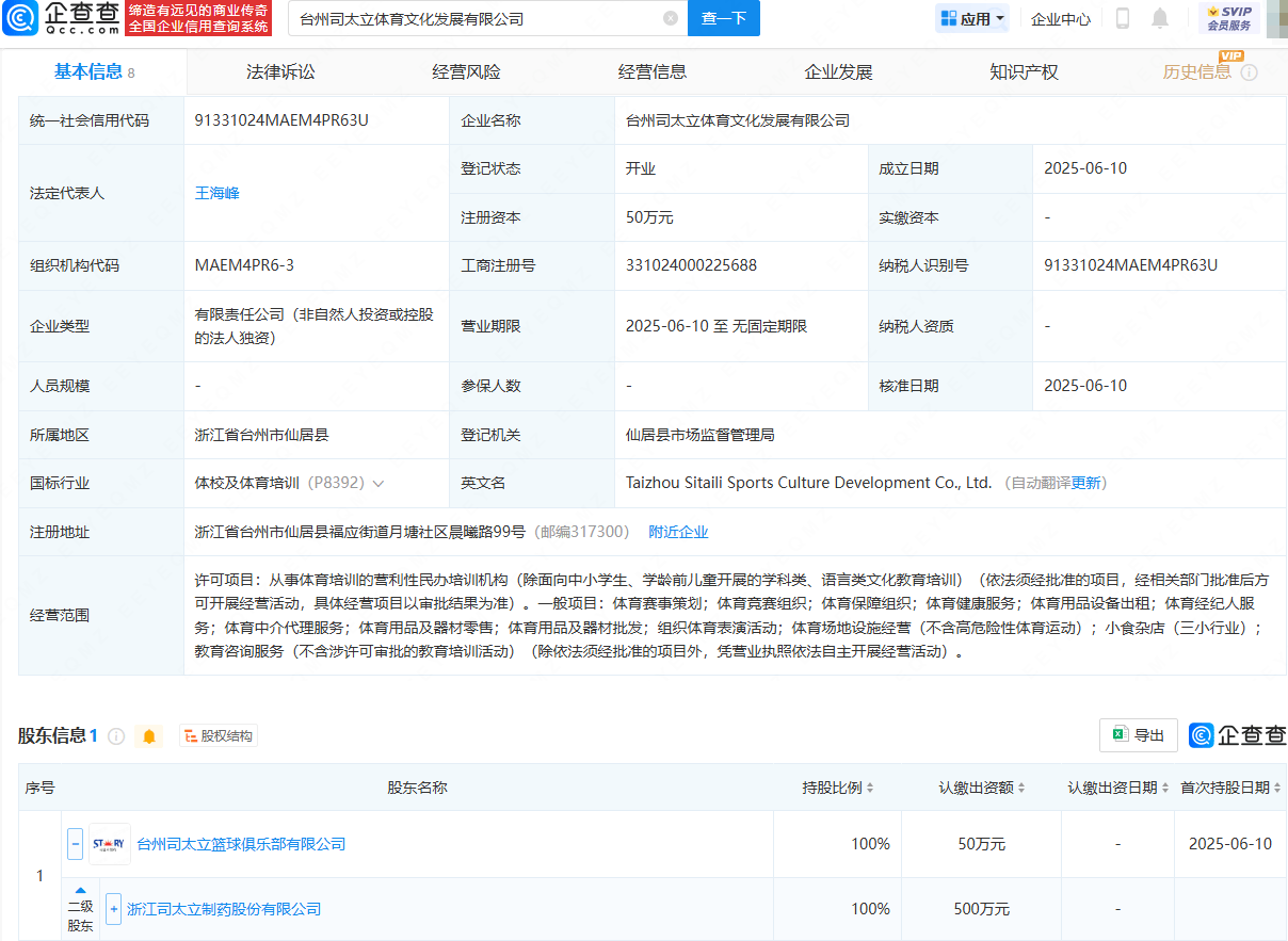 近日,台州司太立体育文化发展有限公司成立,法定代表人为王海峰,注册资本为50万元,经营范围包含:从事体育培训的营利性民办培训机构;体育赛事策划;体育竞赛组织;体育保障组织;体育健康服务;体育用品设备出租;体育经纪人服务等。股权穿透显示,该公司由司太立间接全资持股。