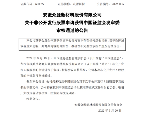 中国经济网北京9月20日讯众源新材(603527.SH)昨晚公告称,中国证监会发行审核委员会昨日对公司非公开发行A股股票的申请进行了审核。根据会议审核结果,公司本次非公开发行A股股票的申请获得审核通过。截至公告日,公司尚未收到中国证监会对本次非公开发行A股股票事宜的书面核准文件,公司将在收到中国证监会予以核准的正式文件后另行公告。
