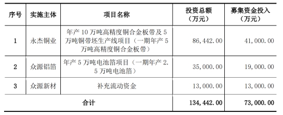 本次非公开发行股票募集资金总额不超过73000.00万元,扣除发行费用后的募集资金净额将用于以下项目:年产10万吨高精度铜合金板带及5万吨铜带坯生产线项目(一期年产5万吨高精度铜合金板带)、年产5万吨电池箔项目(一期年产2.5万吨电池箔)、补充流动资金。