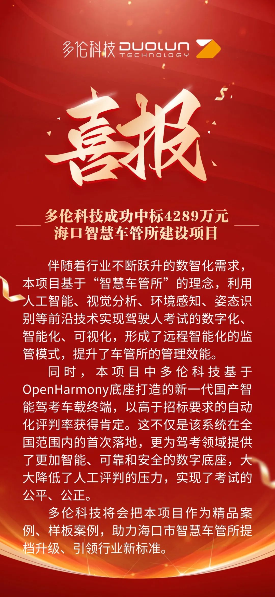 近期,多伦科技智慧车管捷报频传,成功中标“海口机动车驾驶人考试中心项目”,中标金额4289万元。此次中标城市级智慧车管项目,标志着公司基于核心技术的“数智车管所”整体解决方案能力,在智慧车管领域的整体服务能力已达到业界领先水平。