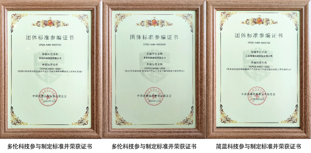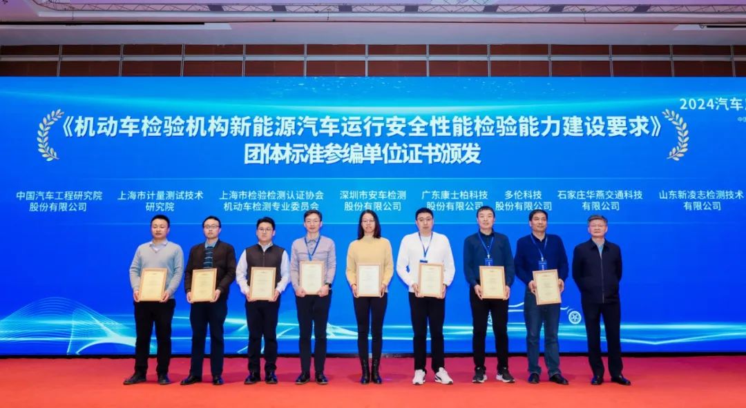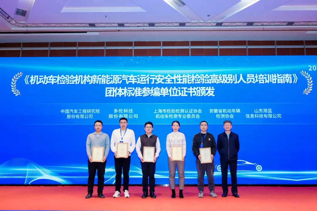 2024年12月13日,由中国汽车工程研究院股份有限公司主办,中国消费品质量安全促进会、中国汽车维修行业协会协办的“2024汽车后市场创新发展大会”在北京举办。多伦科技及旗下简蓝科技共同参与制定的两项新能源汽车检测标准——《机动车检验机构新能源汽车运行安全性能检验能力建设要求》和《机动车检验机构新能源汽车运行安全性能检验高级别人员培训指南》正式发布,并在此会议正式颁发证书。