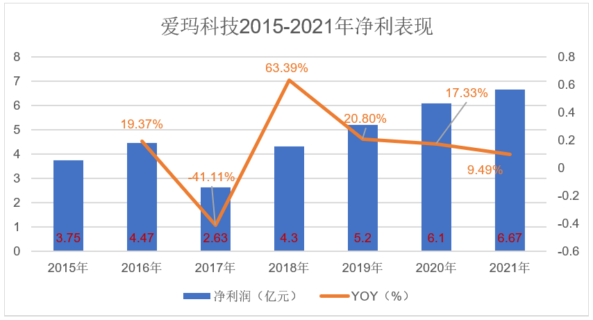 BT财经整理发现,爱玛科技的营业收入虽然保持了每年的正增长,但同比增速并不稳定,起伏较大;而净利润在2018年后增速明显放缓,已降至个位数。
