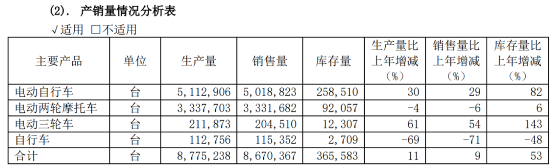 存货更是积压严重,2021年7.96亿元,2020年4.95亿元,同比增长60.8%,其中库存商品由2.8亿涨至4.4亿,同比增长57%。贡献了最大营收的电动自行车,虽然产销量同比提升了30%,但库存量增幅达到惊人的82%。