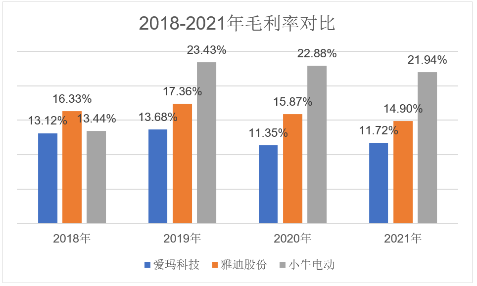 2021年爱玛科技整体毛利率为11.72%,也不及雅迪股份的14.9%和小牛电动的21.94%。