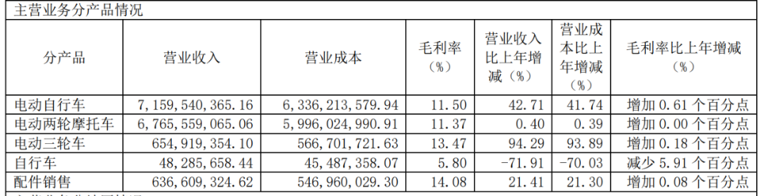 从业务增长来看,爱玛科技的电动两轮摩托车在2021年几乎增长停滞,仅比上年多了3000万,同比增长只有0.4%。相比之下,电动自行车营收增长了21.4亿,占总营收增长的86%,同比增加42.71%。