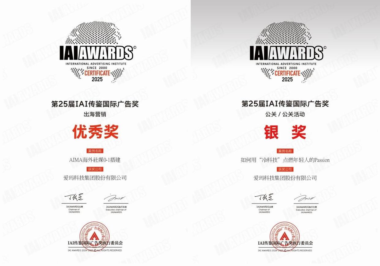 据权威数据显示,2025年一季度,我国电动两轮车市场呈现出全面增长的态势,除了技术突破、全球化布局之外,营销创新也为这样的增长提供了强劲赋能。其中,作为行业头部品牌,爱玛科技(603529.SH)在营销领域更是充分展现了强劲的实力,凭借在产品、品牌、营销等领域的联动创新,使品牌化营销手段与产品差异化竞争力、领先的研发创新能力与不断拓展的全球化布局形成合力,不仅在广大消费者心中构筑起更加立体的品牌认知,更藉此斩获了第25届IAI传鉴国际广告奖出海营销优秀奖、第25届IAI传鉴国际广告奖公关\公关活动银奖、iBrandi 品创奖品创年度品牌、虎啸奖年度品牌数字化大奖、虎啸奖海外营销类金奖、虎啸奖电商及效果营销类-大促与节日营销类金奖、AIGC营销类银奖等一系列重要奖项。