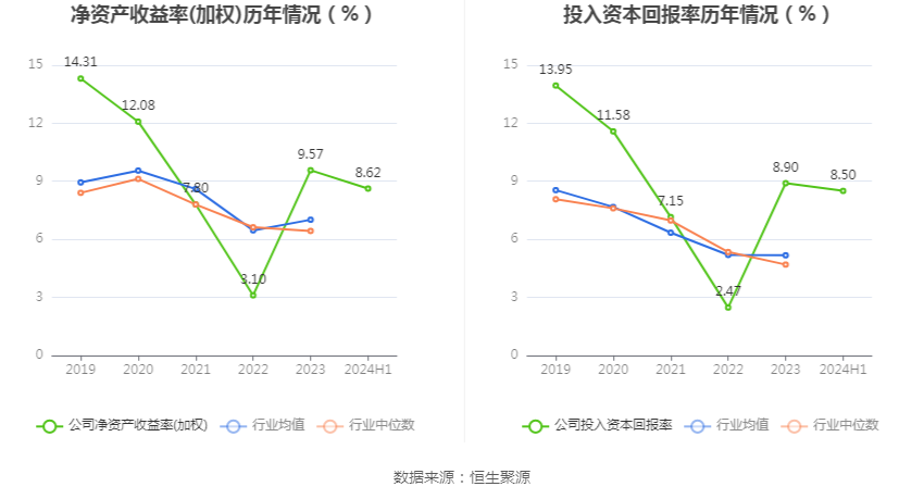数据显示,2024年上半年公司加权平均净资产收益率为8.62%,较上年同期增长5.46个百分点;公司2024年上半年投入资本回报率为8.50%,较上年同期增长5.78个百分点。