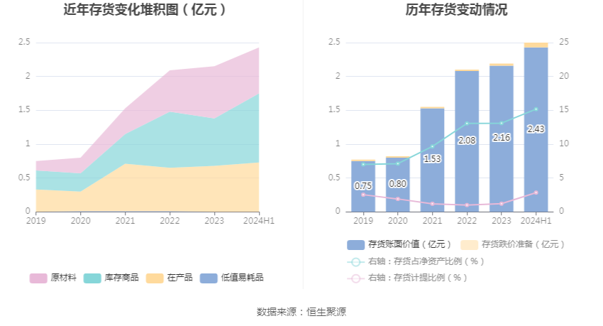 从存货变动来看,截至2024年上半年末,公司存货账面价值为2.43亿元,占净资产的15.17%,较上年末增加2703.75万元。其中,存货跌价准备为710.12万元,计提比例为2.84%。