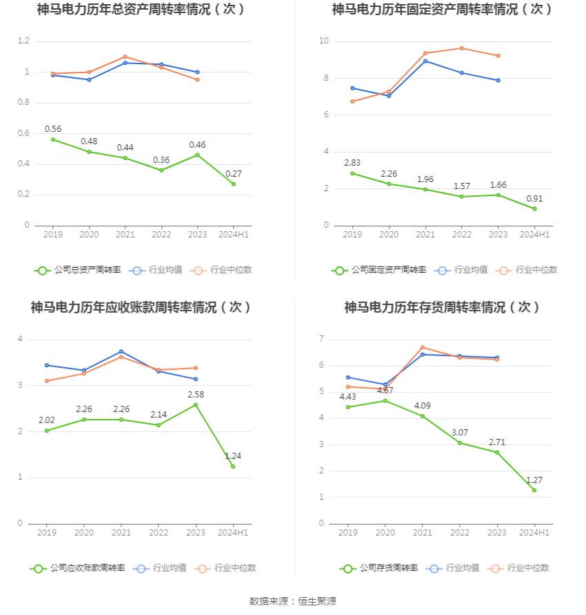 营运能力方面,2024年上半年,公司公司总资产周转率为0.27次,上年同期为0.21次(2023年上半年行业平均值为0.49次,公司位居同行业32/37);固定资产周转率为0.91次,上年同期为0.75次(2023年上半年行业平均值为3.97次,公司位居同行业35/37);公司应收账款周转率、存货周转率分别为1.24次、1.27次。