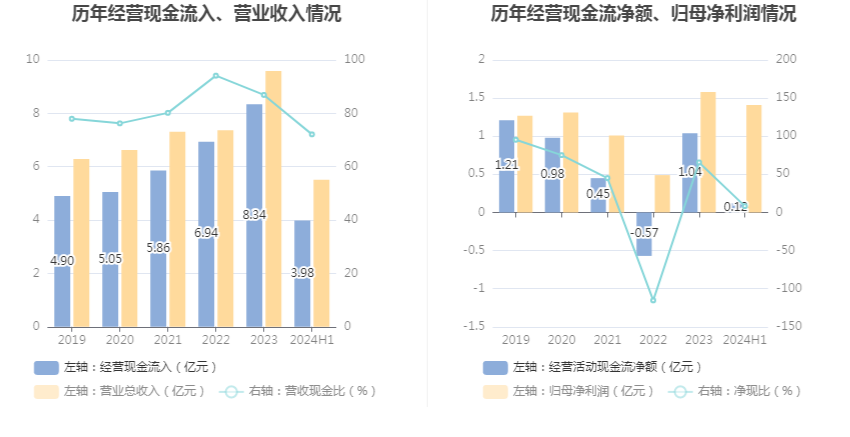 2024年上半年,公司营业收入现金比为72.13%,净现比为8.33%。