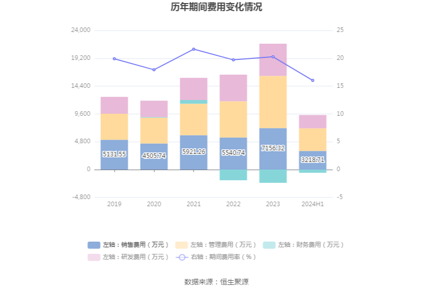 2024年上半年,公司期间费用为8842.87万元,较上年同期增加976.20万元;但期间费用率为16.03%,较上年同期下降2.90个百分点。其中,销售费用同比下降10.11%,管理费用同比增长3.34%,研发费用同比下降4.65%,财务费用由去年同期的-1887.83万元变为-564.07万元。