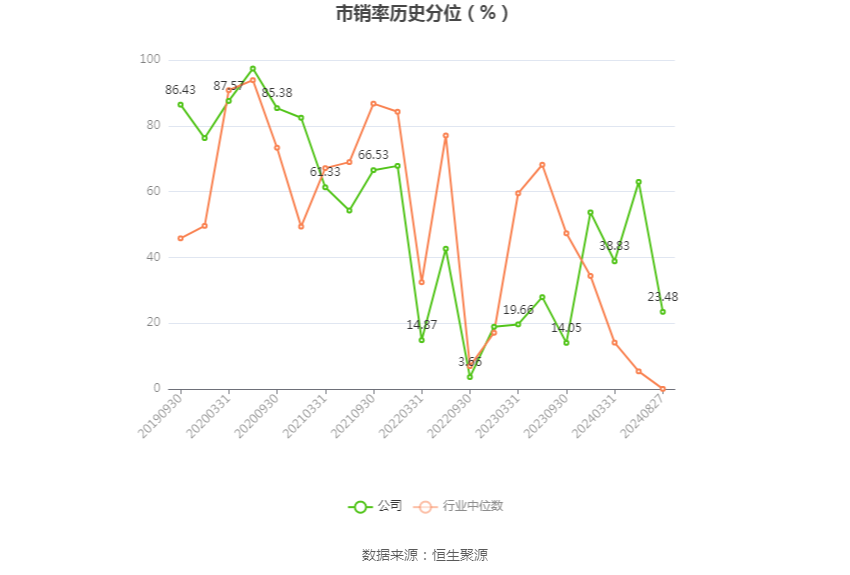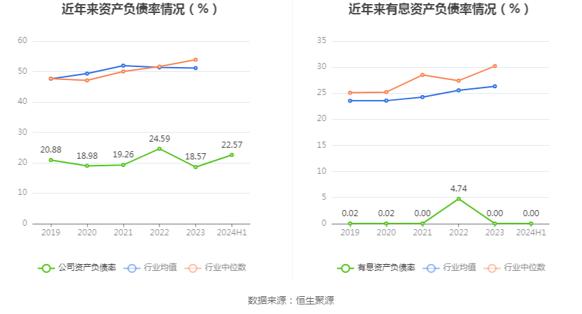 在偿债能力方面,公司2024年上半年末资产负债率为22.57%,相比上年末上升4.00个百分点;有息资产负债率为0,相比上年末基本持平。