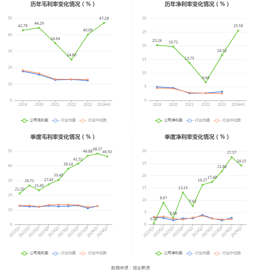 2024年上半年,公司毛利率为47.28%,同比上升12.74个百分点;净利率为25.58%,较上年同期上升13.35个百分点。从单季度指标来看,2024年第二季度公司毛利率为46.50%,同比上升8.36个百分点,环比下降1.87个百分点;净利率为24.15%,较上年同期上升7.88个百分点,较上一季度下降3.42个百分点。