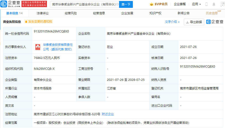 企查查APP显示,7月26日,南京华泰紫金新兴产业基金合伙企业(有限合伙)成立,执行事务合伙人为华泰紫金投资有限责任公司,注册资本7.69亿元人民币,经营范围包含:股权投资;创业投资(限投资未上市企业)。