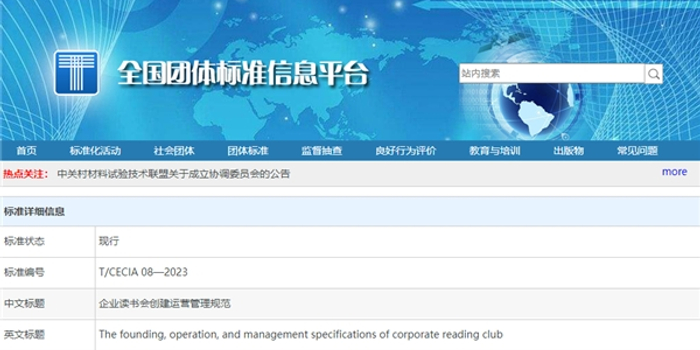 4月23日,由中国企业文化促进会阅读专业委员会牵头起草,掌阅科技旗下掌阅精选等单位参与制定的《企业读书会创建运营管理规范》团体标准(标准编号:T/CECIA 08-2023)正式在全国范围内开始实施,企业阅读推广正式进入规范化、标准化、体系化发展阶段。