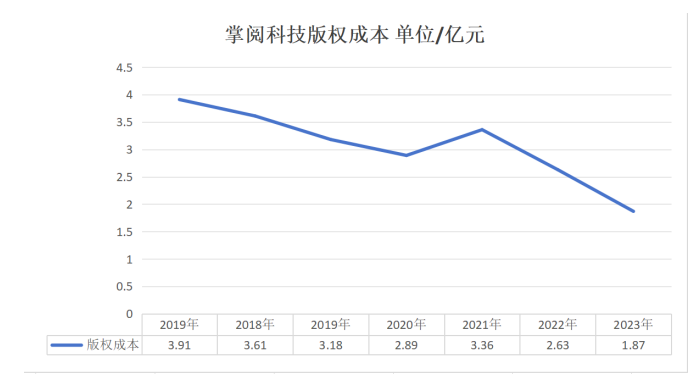 据立方舆情通统计,近年来,掌阅科技版权采购成本逐年下降。2023年,其版权成本仅1.87亿元,较2019年下降过半。