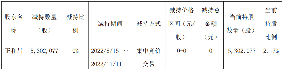 股份减持计划实施前,正和昌投资有限公司(以下简称“正和昌”)持有山东惠发食品股份有限公司(以下简称“公司”)无限售条件的流通股份5,302,077股,占公司总股本比例为2.17%,股份来源于公司首次公开发行前股份以及发行上市后以利润分配及资本公积转增股本方式取得的股份。