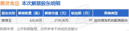 根据市场公开信息整理,惠发食品(603536)于 6 月 13 日将有 420.0 万股限售股份解禁上市,为公司定向增发机构配售股份,占公司总股本 1.72%。最近一年内,该股累计解禁 255.71 万股,占总股本的 1.05%。本次解禁后,公司已无限售股份。具体如下图所示: