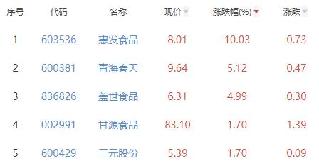 其中,惠发食品、青海春天、盖世食品、甘源食品、三元股份位列板块涨幅前五位,涨幅分别为10.03%、5.12%、4.99%、1.70%、1.70%。