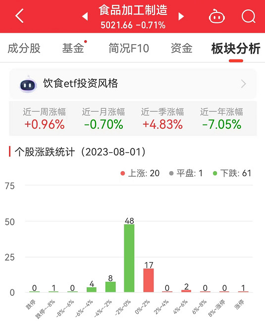 数据显示,截至今日,食品加工制造板块近一周涨幅0.96%,近一月涨幅-0.70%,近一季涨幅4.83%。