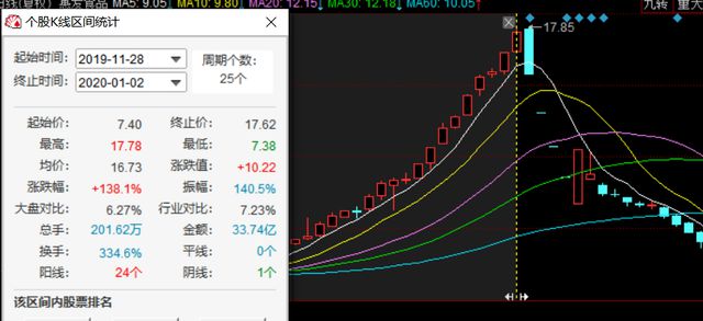 2019年11月28日至2020年1月2日,惠发食品在25个交易日收获24根阳线,股价涨幅138%。2020年1月3日创下17.85元高点,随后连续跌停。