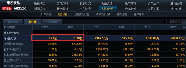 从业绩来看,2021年和2022年,惠发食品的净利润数据都是亏损的,亏损额合计2.58亿元,超过2017年至2020年的合计净利润数值。