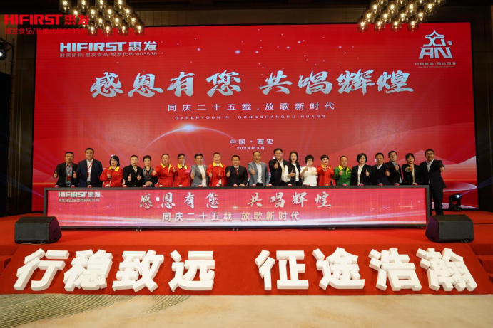 奋进廿五载,放歌新时代,签约仪式后,惠董等公司领导与合作伙伴代表上台,共同见证了惠发食品25周年庆典的盛大启幕。