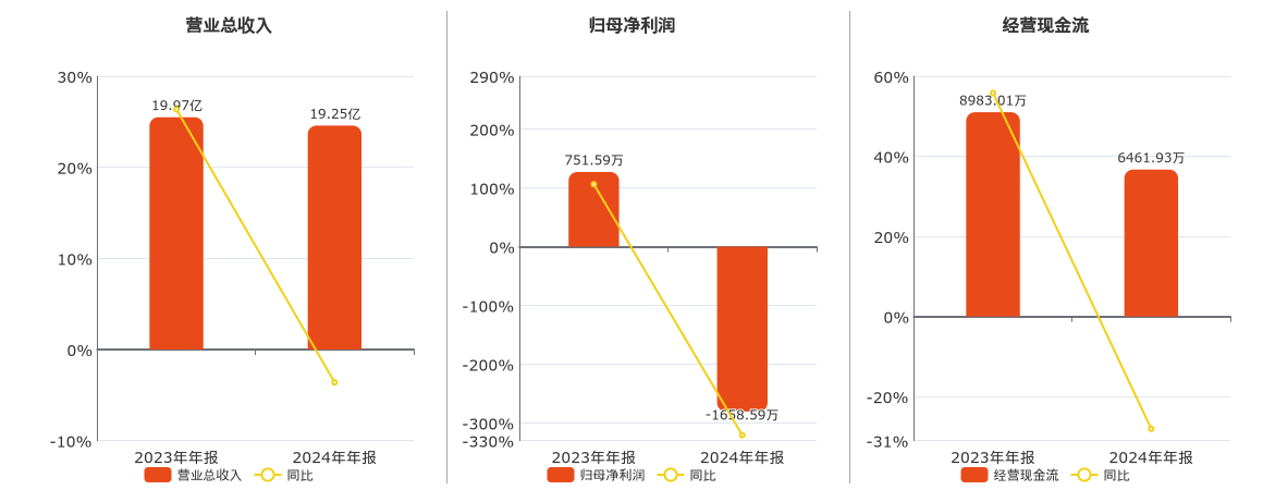 公司营业总收入为19.25亿元,较去年同报告期营业总收入减少7209.28万元,同比较去年同期下降3.61%。归母净利润为-1658.59万元,较去年同报告期归母净利润减少2410.18万元,同比较去年同期下降320.68%。经营活动现金净流入为6461.93万元,较去年同报告期经营活动现金净流入减少2521.08万元,同比较去年同期下降28.06%。