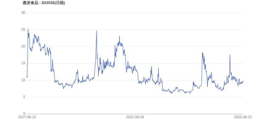 2023年12月6日,惠发食品的市值巅峰达到49.47亿元,股价也顺应升至20.22元。而至6月12日收盘,惠发食品的股价为9.69元,市值为23.71亿元,相比峰值时期市值减少25.76亿元,市值蒸发了52.08%。