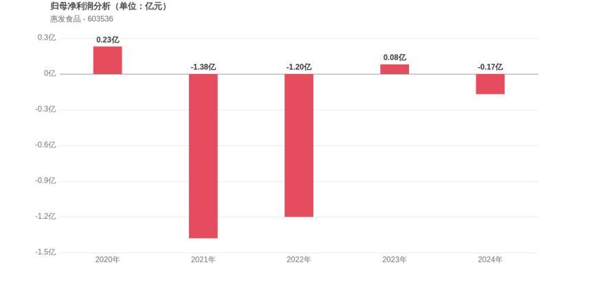 利润角度分析,2020年惠发食品实现归母净利润0.23亿元,2024年-0.17亿元。利润表现极不稳定,从盈利转为亏损状态。