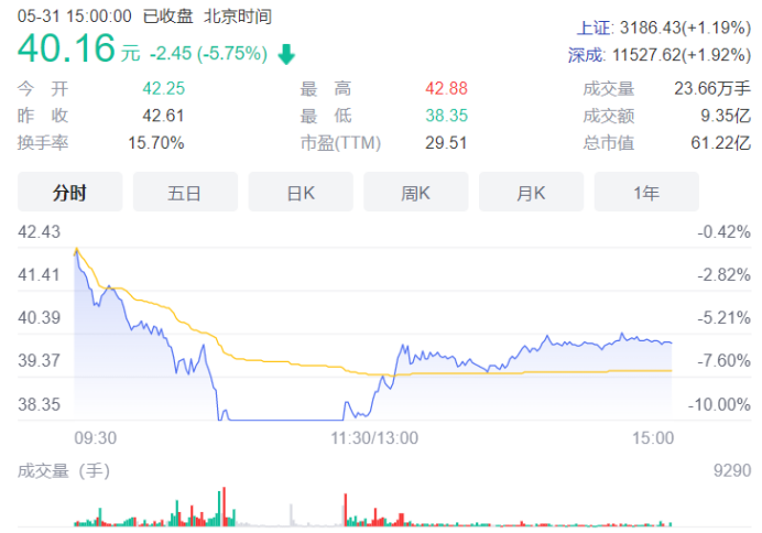 火灾消息一经公布,美诺华盘中直接跌停,午后打开跌停,截至5月31日收盘,美诺华股价报收40.16元/股,跌幅达5.75%。