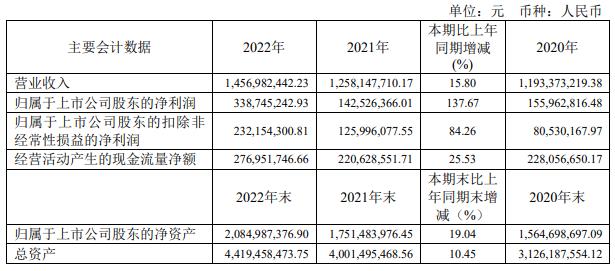 美诺华2022年年度报告显示,2022年,美诺华实现营业收入14.57亿元,同比增长15.80%;归属于上市公司股东的净利润3.39亿元,同比增长137.67%;归属于上市公司股东的扣除非经常性损益的净利润2.32亿元,同比增长84.26%;经营活动产生的现金流量净额2.77亿元,同比增长25.53%。