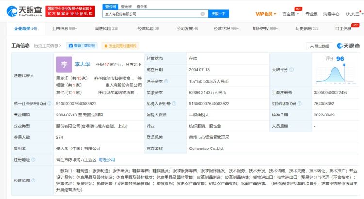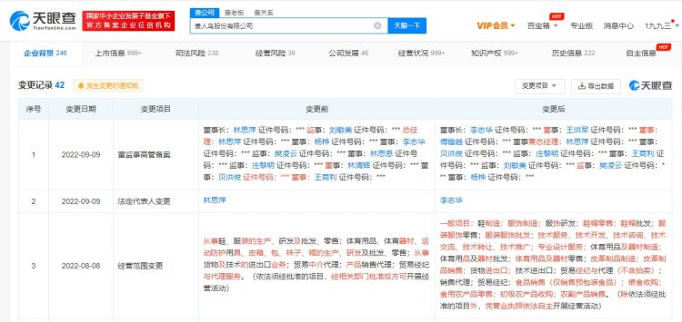 近日,贵人鸟股份有限公司发生工商变更,法定代表人、董事长由林思萍变更为李志华,经营范围新增食品销售、粮食收购、食用农产品零售等。