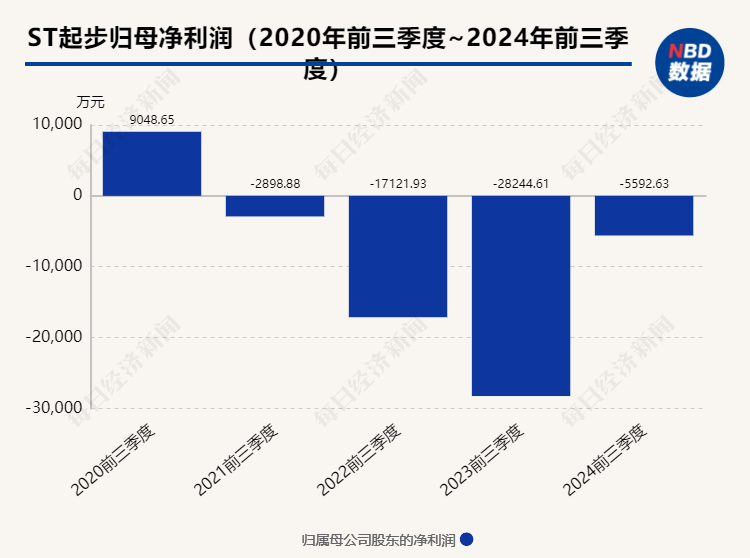 据悉,2024年前三季度,ST起步营业收入仅1.78亿元,归母净利润为亏损5592.63万元,扣非净利润为亏损-5842.13万元,期末归母净资产为376.62万元。如公司2024年度经审计的利润总额、净利润或者扣非净利润孰低者为负值且营业收入低于3亿元,或公司业绩继续亏损导致2024年末公司净资产为负,公司股票将触及退市风险警示。