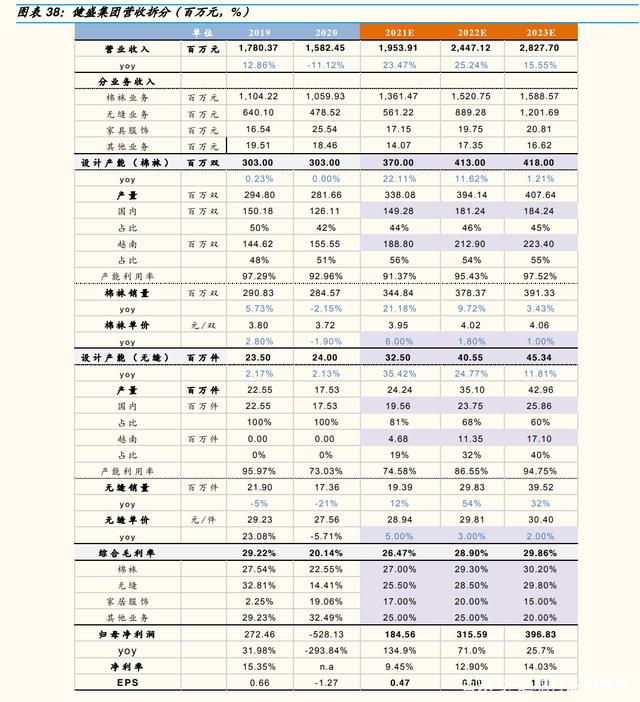 越南扩产计划明确,截至 1H21 国内外无缝织机 450/110 台,预计至 23 年总机器数增至 810 台,21-23 年预计产量 2424/3510/4296 万件;无缝业务卡位内衣、运动双赛道需求饱满,随着产能利用率恢复、接单通畅后客户转单周期有望缩短,叠加公司客户结构调整顺利,预计 21-23 年无缝营收实现 5.61/8.89/12.02 亿元、同增 17%/58%/35%。